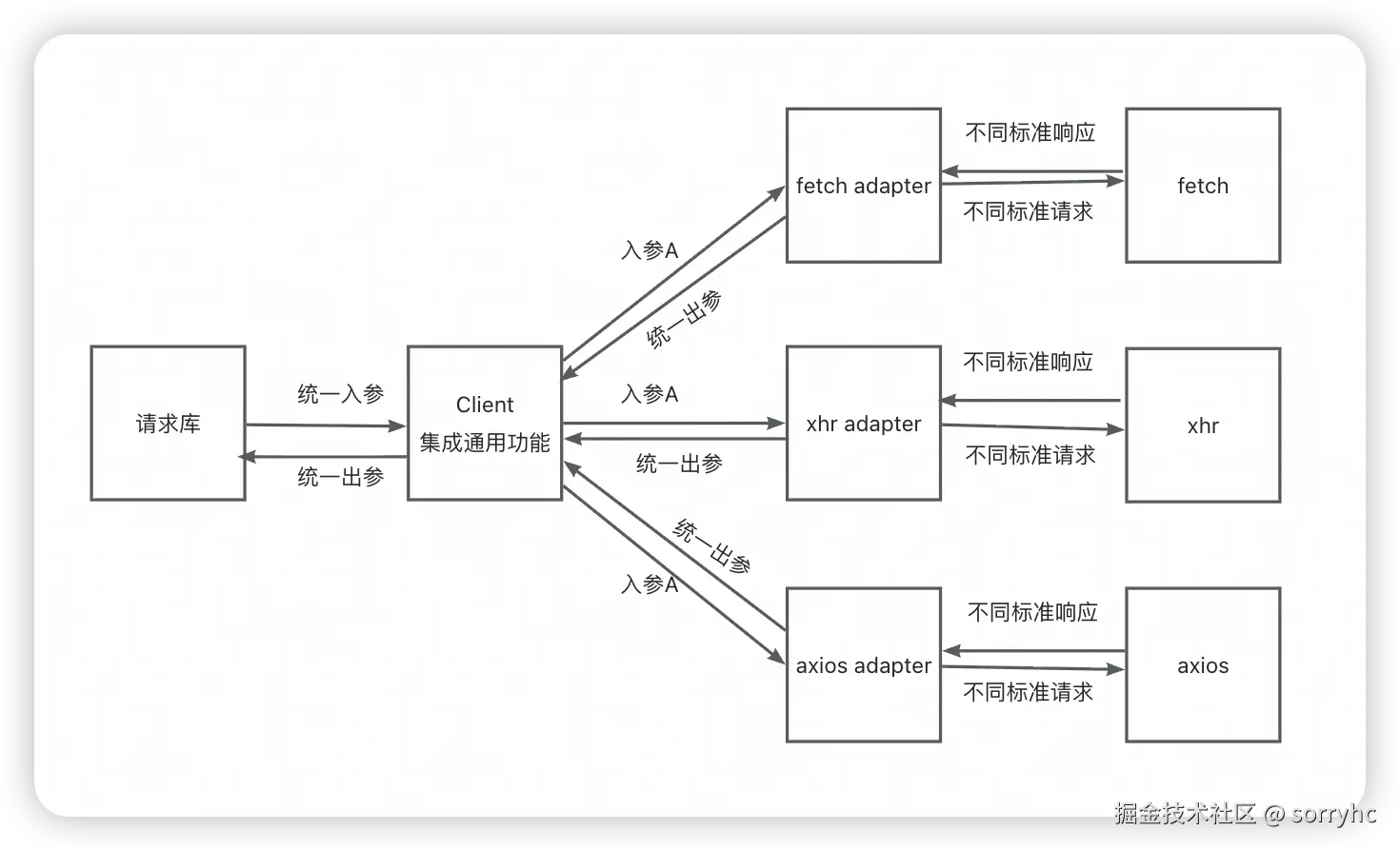 内部,对 入参 和 出参 做一层 标准化处理,这样无论使用什么请求方式,Client 都能拿到统一结构的返回值,同时向 Adapter 传入的 config 也会有统一的字段,这也是很多通用库(axios 等)会做的事。