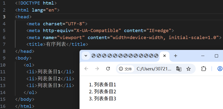 标签:ol嵌套li,ol是有序列表,li是列表条目。
