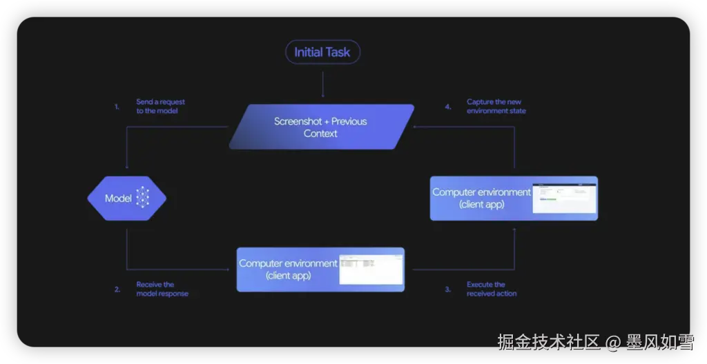 - "反馈与迭代": 指令执行后,屏幕状态随之改变,AI会再次"看"到新的画面,然后进入下一轮"想-做"循环,直到任务圆满完成。