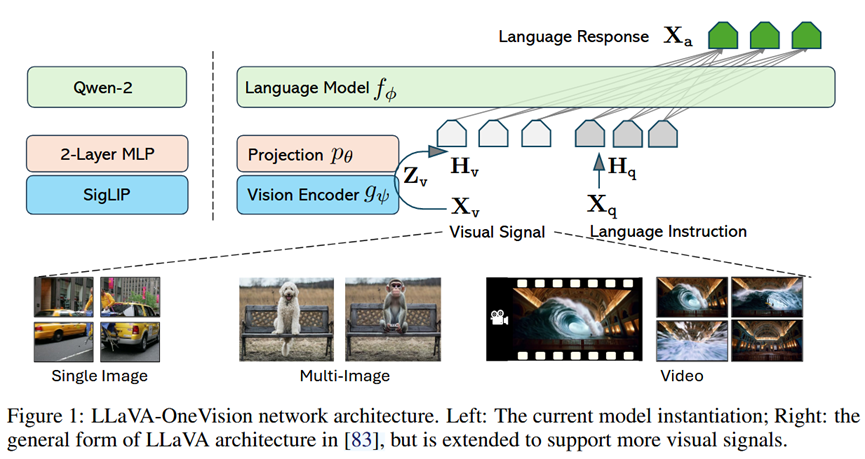 (b) OneVision训练: 在此基础上,用一个包含单图像、多图像和视频的1.6M混合数据集进行进一步微调,将能力泛化到所有场景。