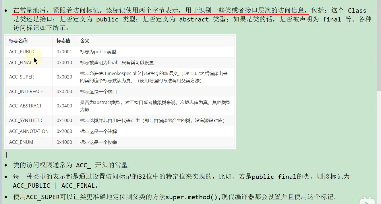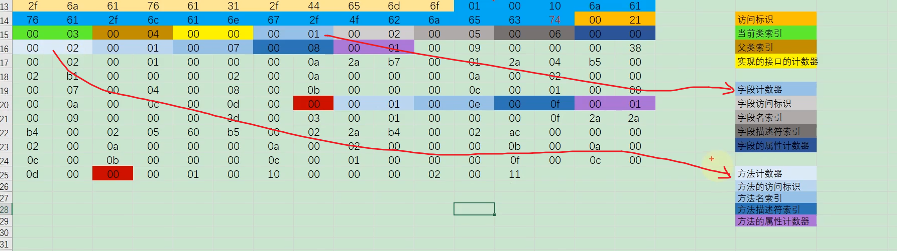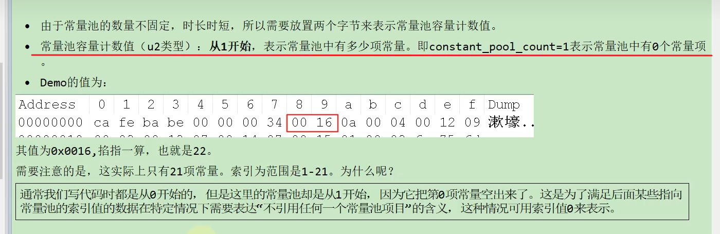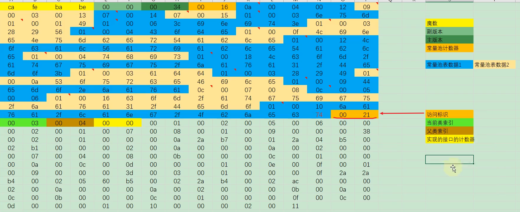 下面这张图包含了该类的访问标识等信息。当前类索引 和父类索引 都是指向常量池的索引,常量池中包含了当前类和父类的相关信息,根据索引才可以查询到相关信息。黄色背景指的是实现接口的计数器,因为当前类并没有实现接口,所以计数器中数值为0.