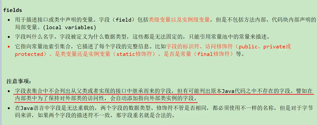 下面这张图给出了该类中字段和方法的信息。字段计数器 表示该类中有多少个字段(即类中的成员变量);字段访问标识表示 该字段的修饰符属性(即public、final等),图中字段访问标识为2,则查表即可得到相关信息;字段名索引 和字段描述符索引 都要去常量池中进行查找;字段的属性计数器表示当前字段有多少个属性。方法的描述信息与字段类似。只不过图中有两个方法。