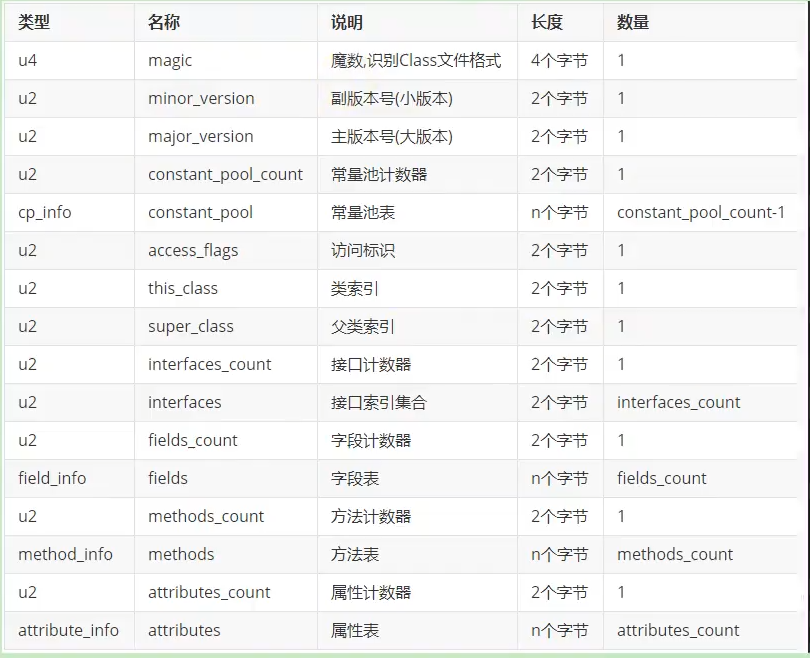 Class文件的总体结构如下:魔数、Class文件版本、常量池、访问标志、索引集合、字段表集合、方法表集合、属性表集合。