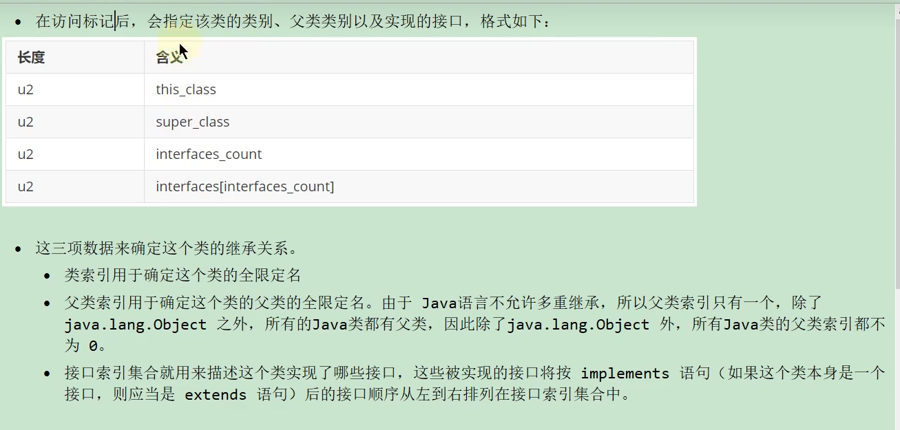 类索引是指向常量池的索引,提供了当前类的全限定名;父类索引也是指向常量池的索引,提供了父类的全限定名。