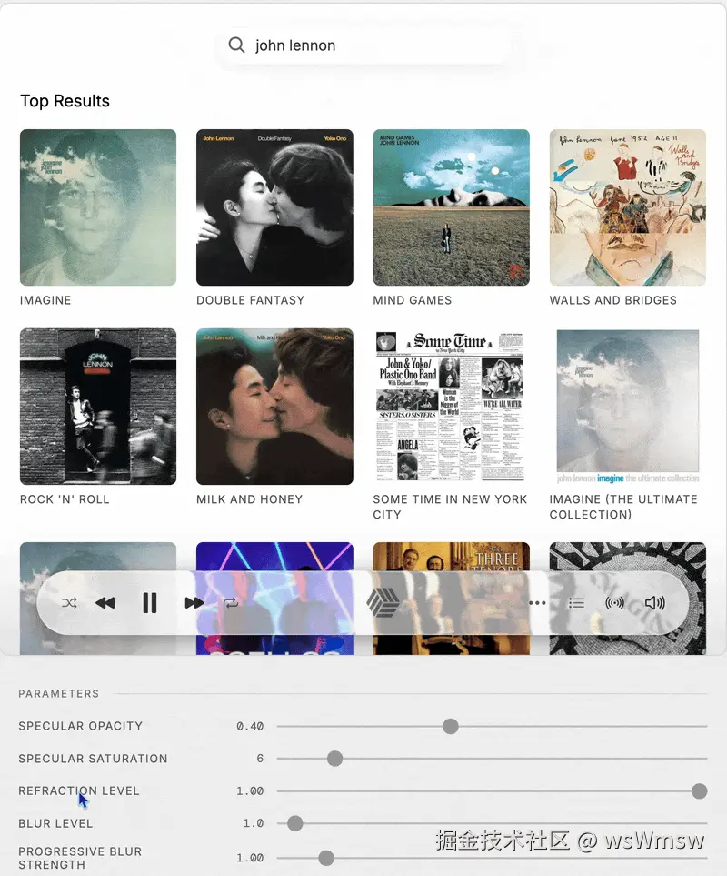 这个复刻版播放器 UI 试图模仿 Apple Music 的玻璃面板观感,使用了凸面玻璃和细微的镜面高光。