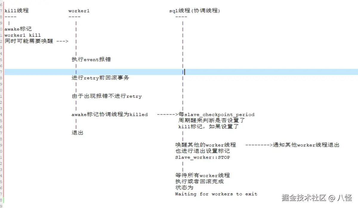 当然这里只是简单描述了可能得交互,但是结果一定是各个worker线程和sql线程(协调线程)都感知到了kill woker1的请求。 那么开头的问题大概可以理解为,