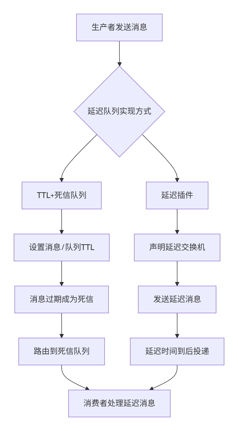 通过设置消息或队列的TTL,使消息在指定时间后过期,然后通过死信机制将过期消息路由到死信队列,消费者监听死信队列即可实现延迟消费。