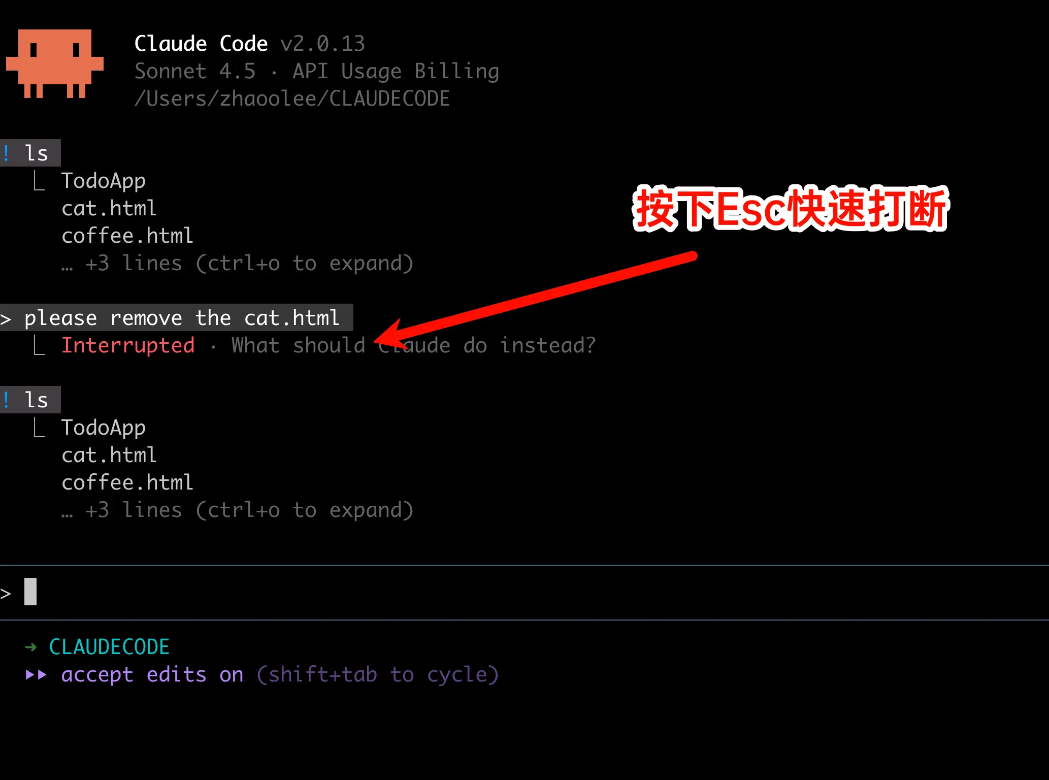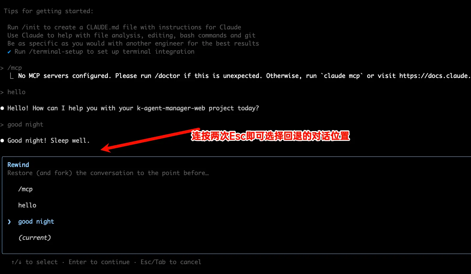 回滚无用的步骤(Claude Code 2.0最近支持的功能,2.0 早期版本有bug,请升级到 2.0.13 以上的版本)