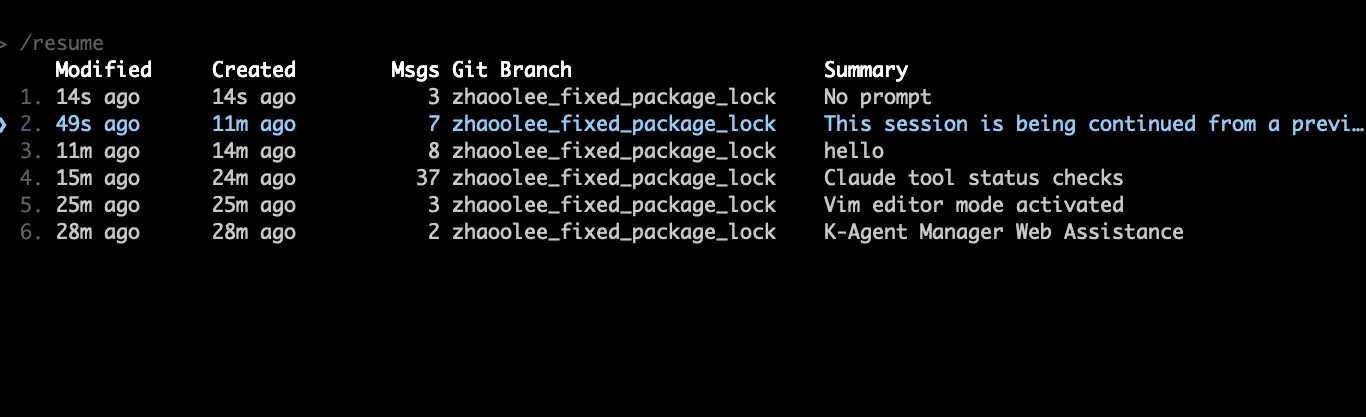 即可选择之前的对话(注意,这里的 resume是针对项目目录的,如果离开项目目录,则 resume无效)