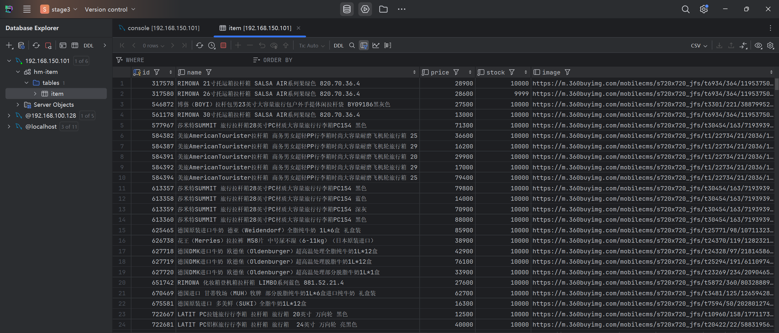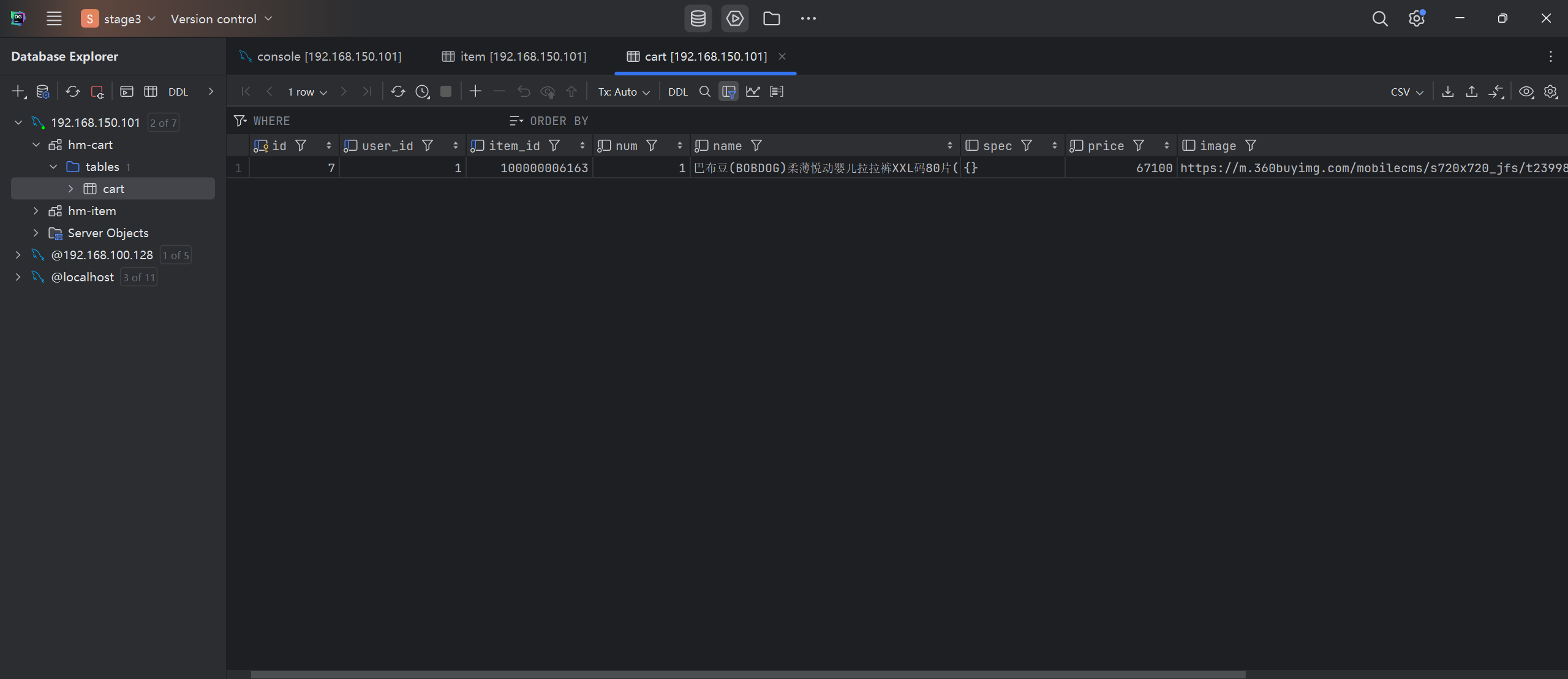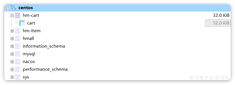 在数据库中会出现名为hm-cart的database,以及其中的cart表,代表购物车: