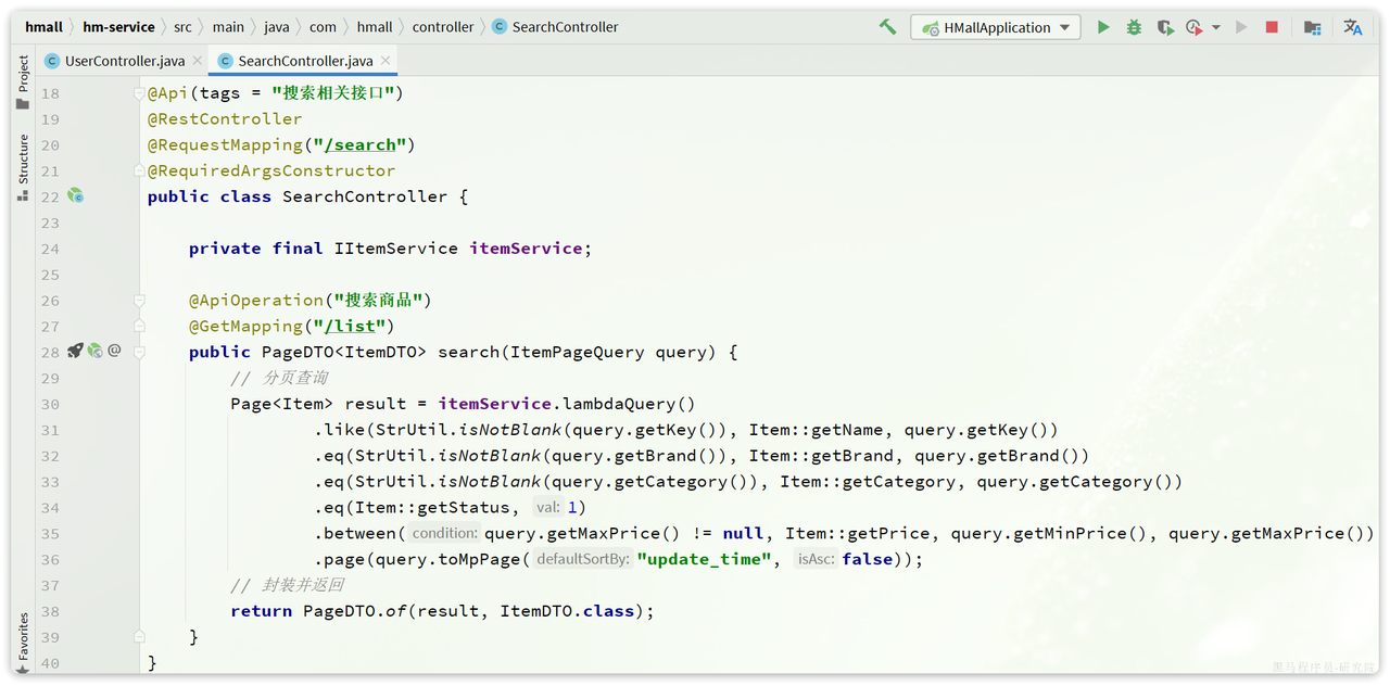 该页面会调用接口:/search/list,对应的服务端入口在com.hmall.controller.SearchController中的search方法: