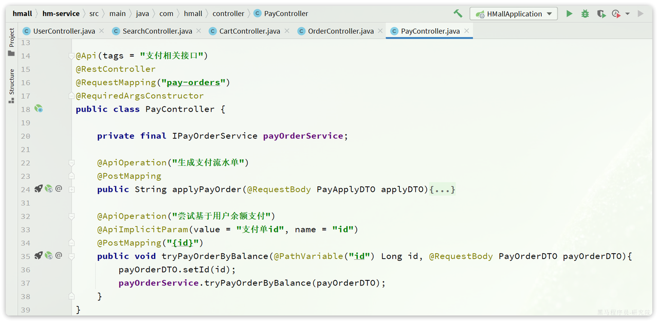 请求入口在com.hmall.controller.PayController中: