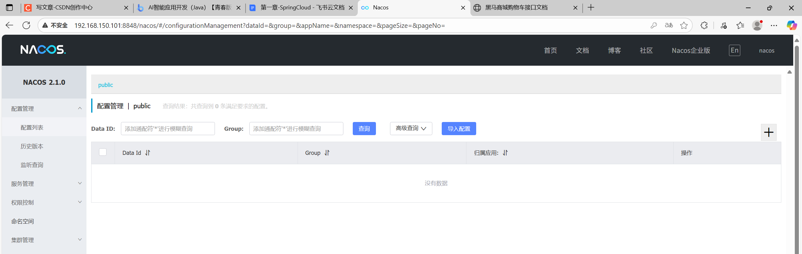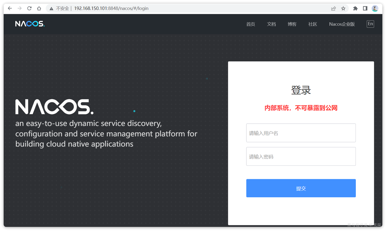 启动完成后,访问下面地址:http://192.168.150.101:8848/nacos/,注意将192.168.150.101替换为你自己的虚拟机IP地址。