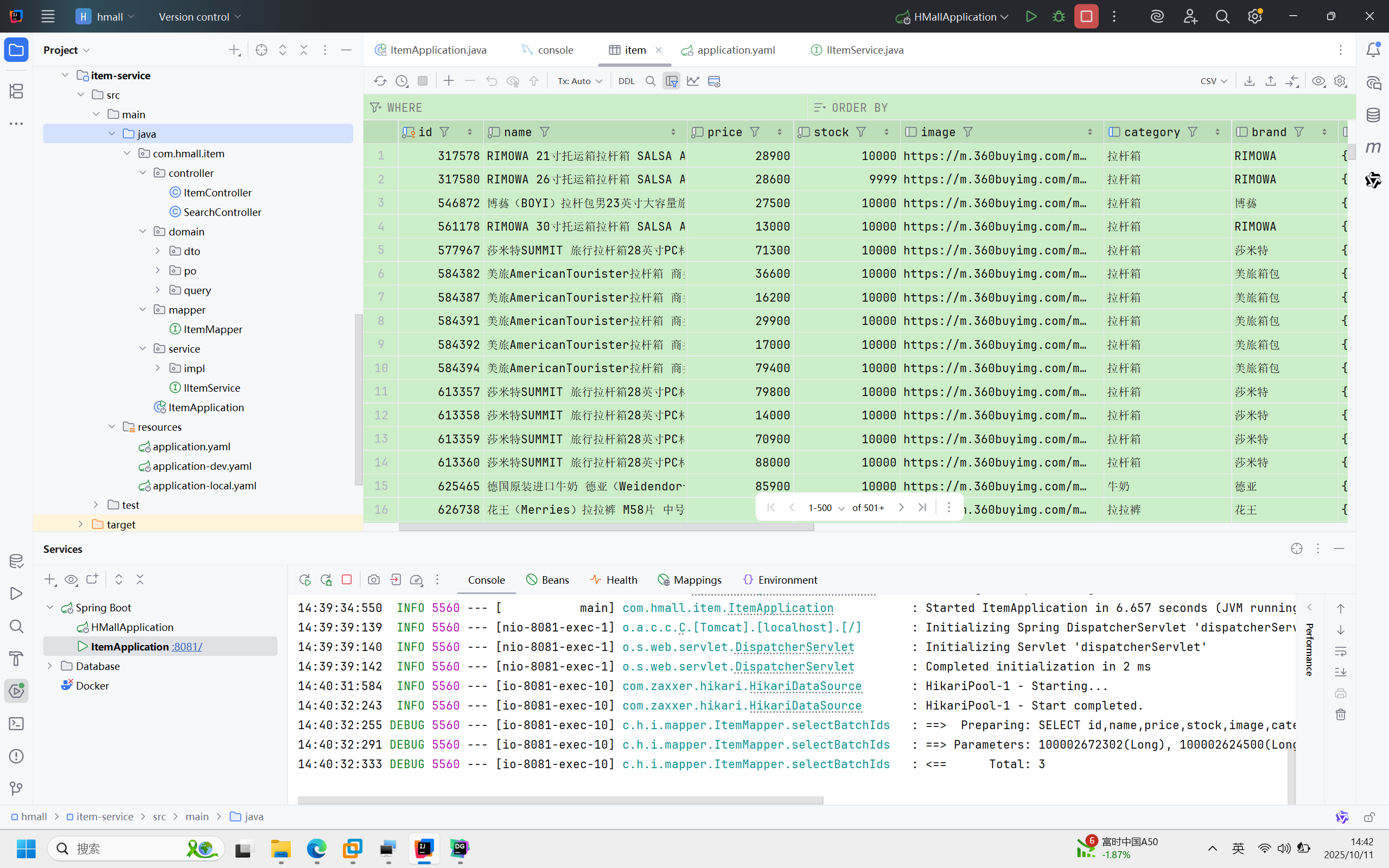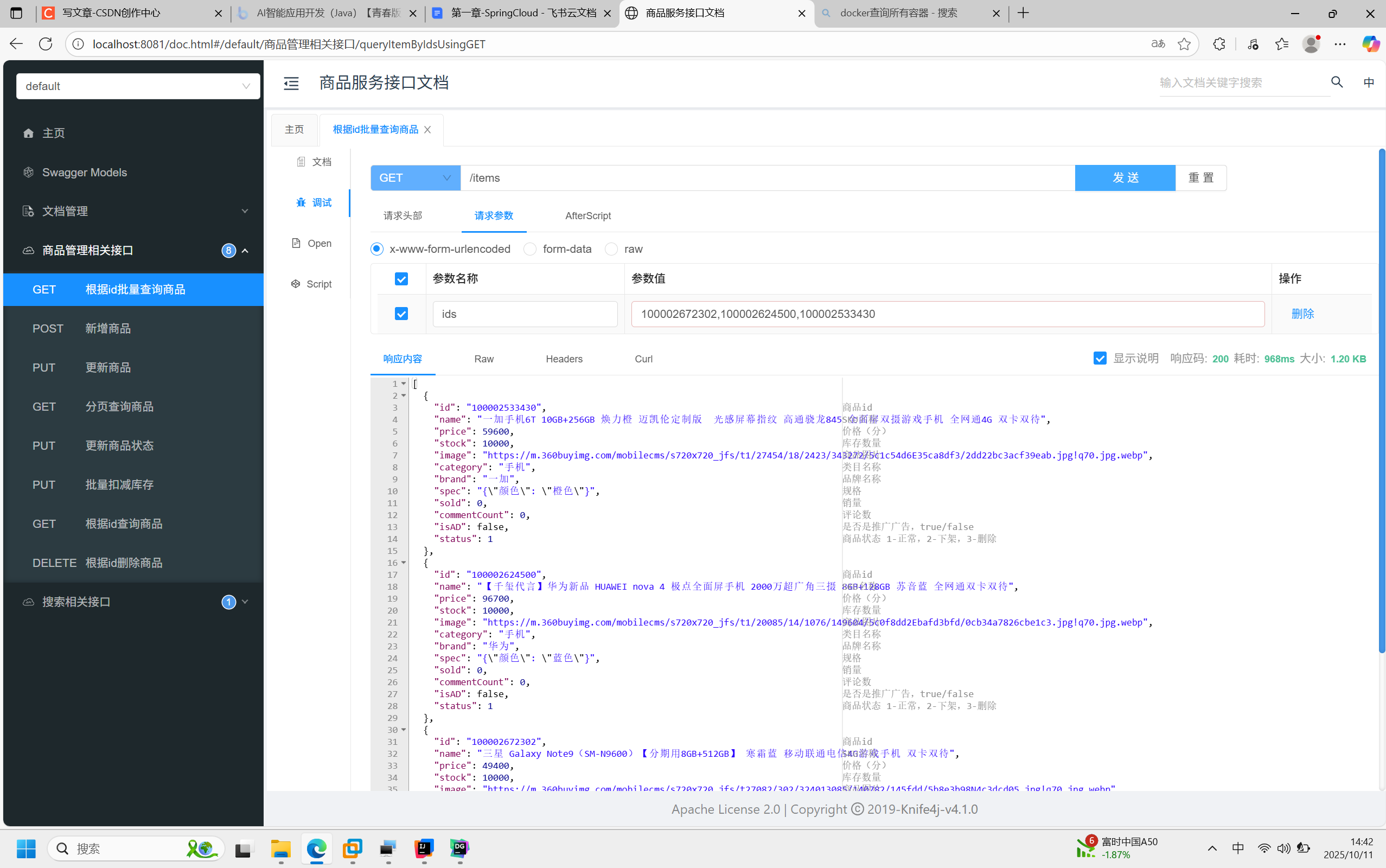 这里碰到一个问题就是,发送测试请求的时候发现返回500,调查发现8081端口的item-service被我关掉了...