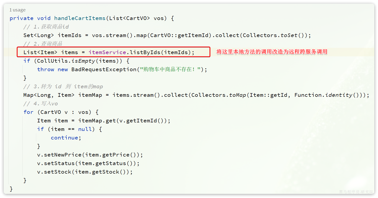 2.接下来,我们修改cart-service中的com.hmall.cart.service.impl.CartServiceImpl的handleCartItems方法,发送http请求到item-service: