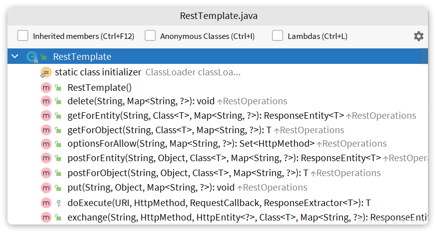 Spring给我们提供了一个RestTemplate的API,可以方便的实现Http请求的发送。其中提供了大量的方法,方便我们发送Http请求,例如: