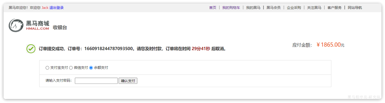 下单完成后会跳转到支付页面,目前只支持余额支付: