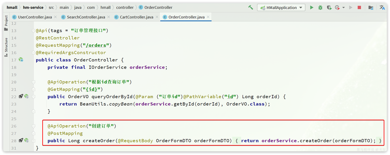 业务入口在com.hmall.controller.OrderController中的createOrder方法: