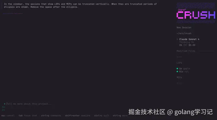 Crush 是由 Charm 团队开发的终端 LLM 工具,具备以下核心能力: