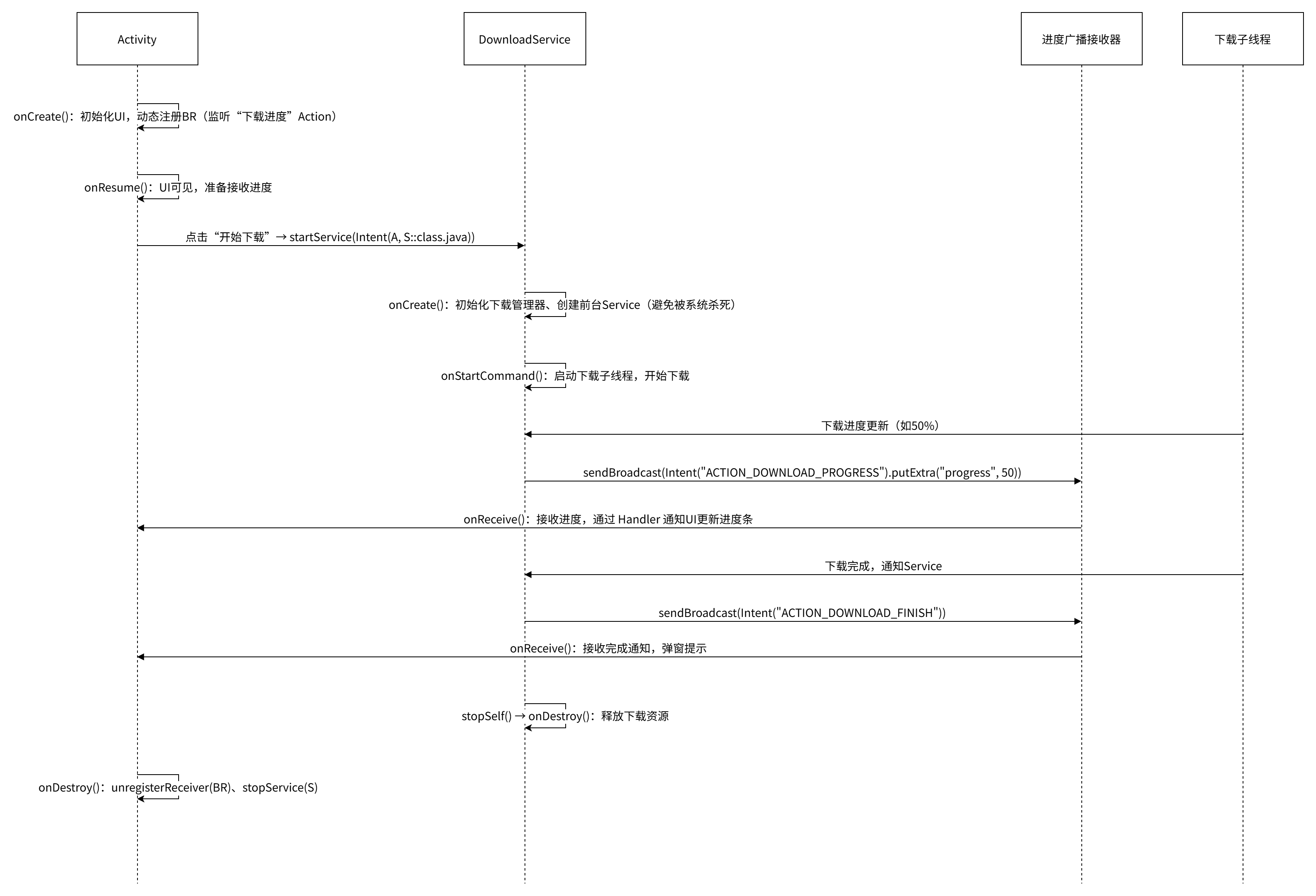 以下时序图展示了 Activity 与 Service、BroadcastReceiver、子线程间的典型交互过程: