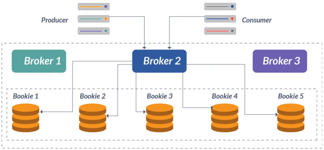 采用计算与存储分离的分层架构。无状态的 Broker 负责处理消息的生产和消费逻辑,而消息的持久化存储则由一个独立的 BookKeeper 集群(称为 Bookies)负责。这种设计允许计算和存储资源根据需求独立、弹性地扩展,并天然支持自动负载均衡和故障恢复。