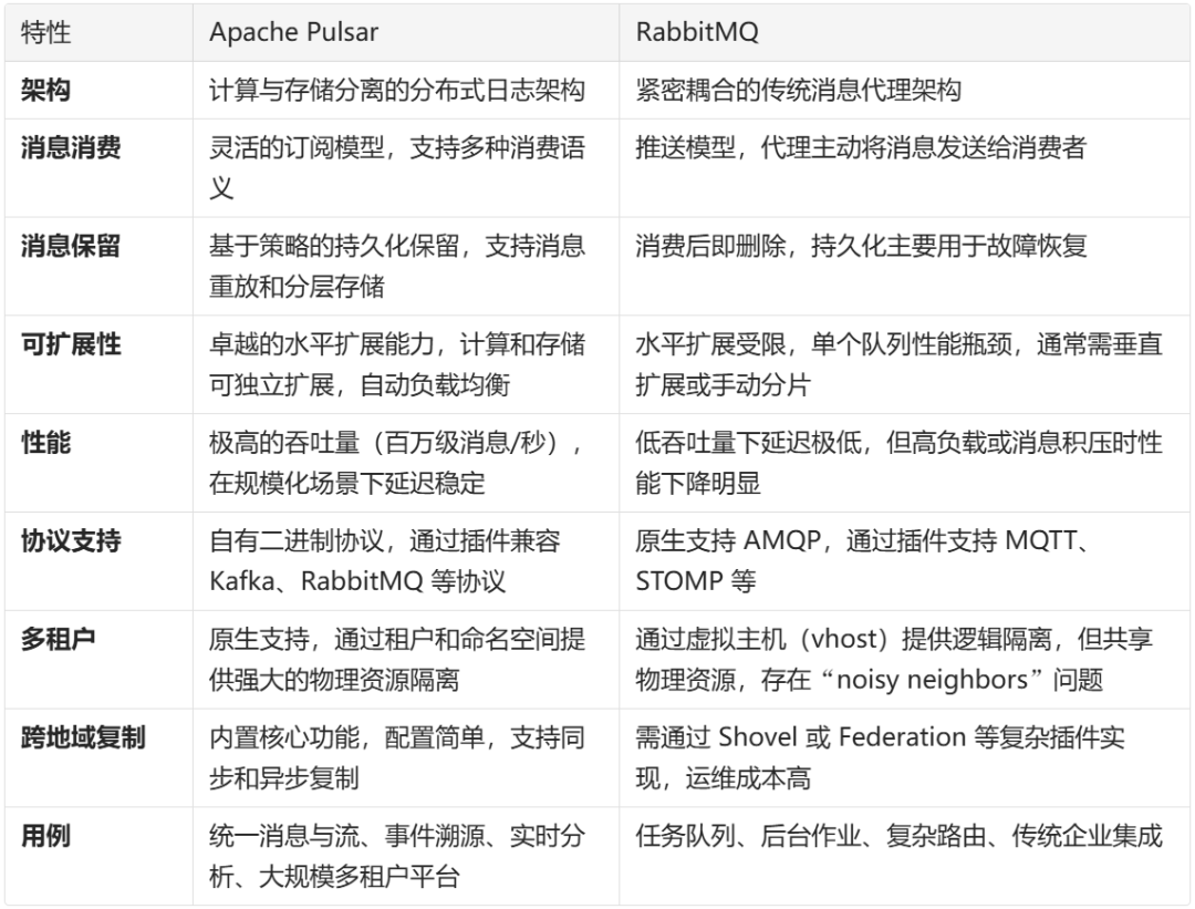 RabbitMQ 是一个成熟、可靠、功能丰富的传统消息代理,非常适合传统的企业应用集成和任务队列,小规模使用。而 Pulsar 则是一个面向未来的云原生消息中间件平台,其在可扩展性、数据持久化、多租户和统一消息与流方面的架构优势,使其成为应对现代大规模、数据驱动型应用和 AI 原生应用挑战的更佳选择。