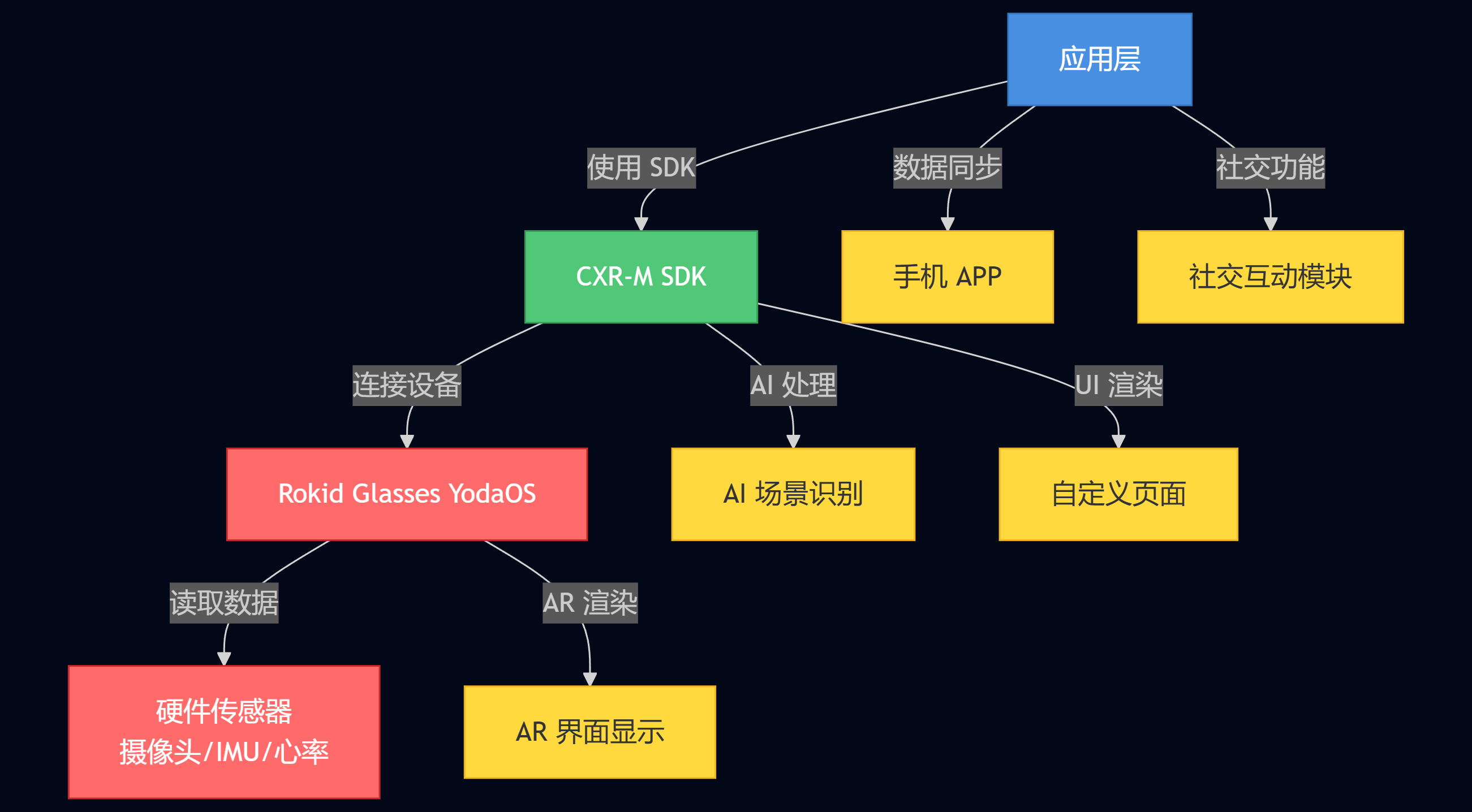 应用层(Android App) → CXR-M SDK → Rokid Glasses(YodaOS) → 硬件传感器