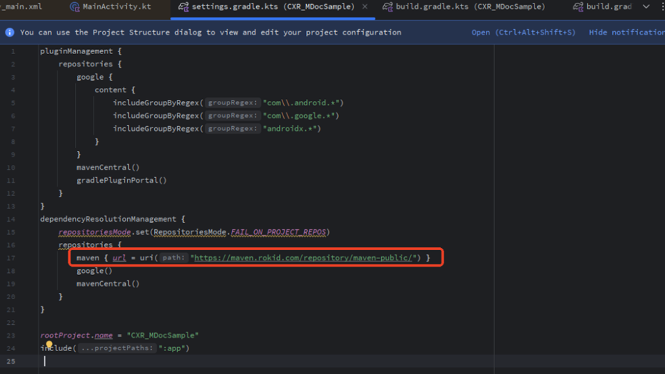 找到settings.gradle.kts,并在dependencyResolutionManagement节点的repositories 中添加Maven仓库。