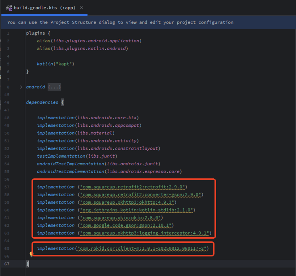 在build.gradle.kts 的dependencies 节点中添加依赖。
