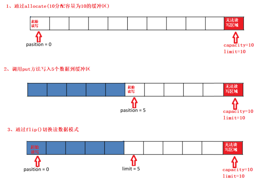 Buffer flip() 为 将缓冲区的界限设置为当前位置,并将当前位置充值为 0
