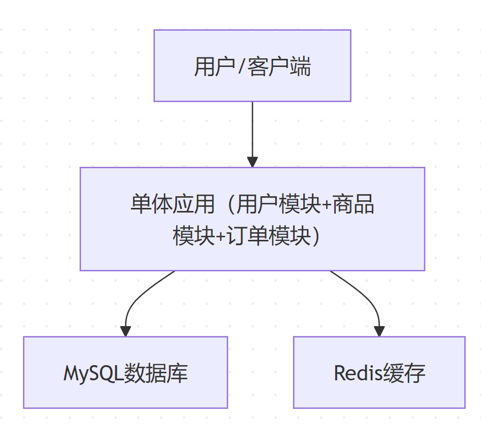 特点 :所有功能模块打包成一个应用,部署简单但扩展性差;适用场景:小型项目、创业初期快速迭代。