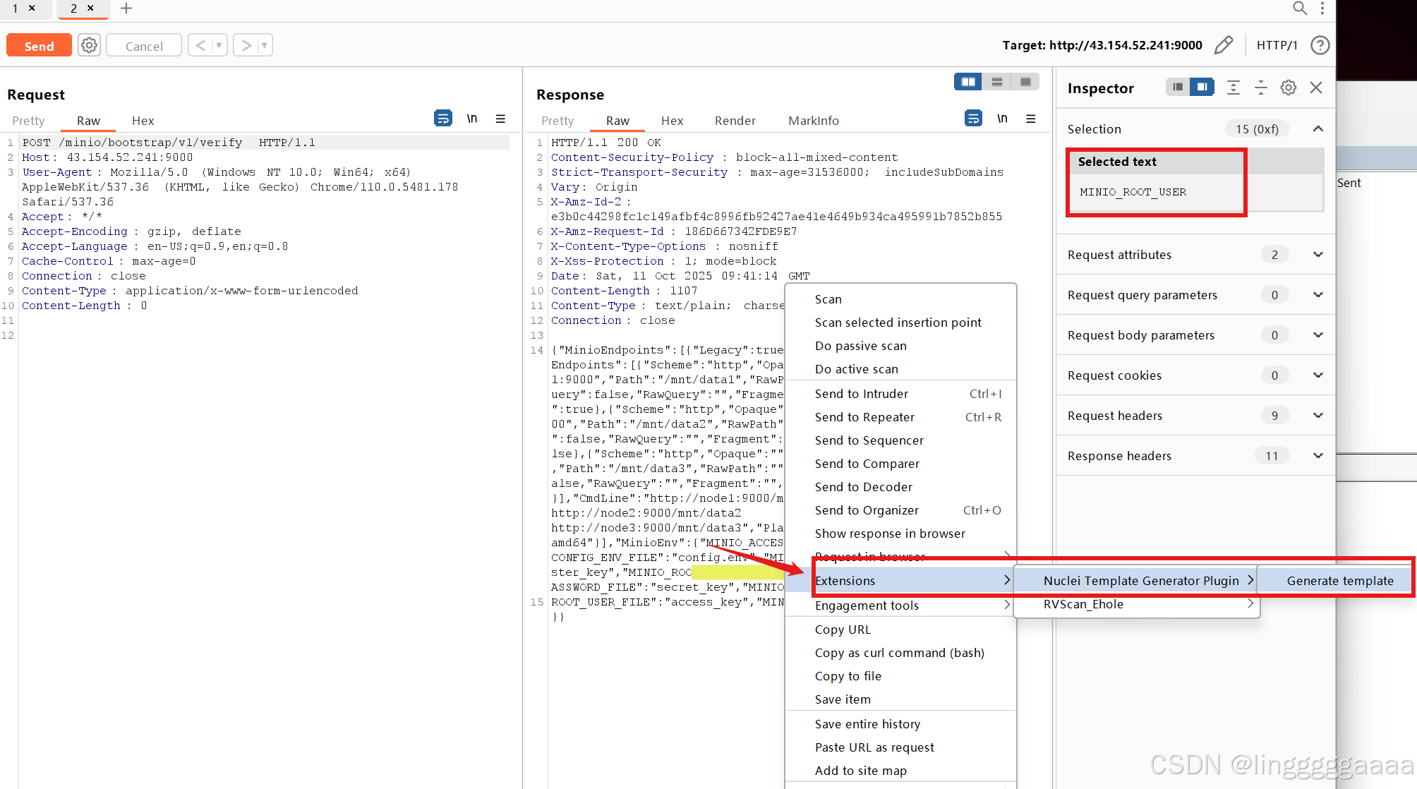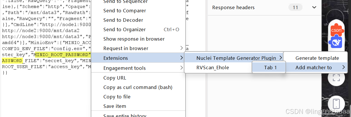 这里我们还是用刚才的CVE-2023-28432来做演示,我们先正常验证漏洞存在,然后选中响应包中验证漏洞存在的关键字"MINIO_ROOT_USER",右键选择刚刚的插件:
