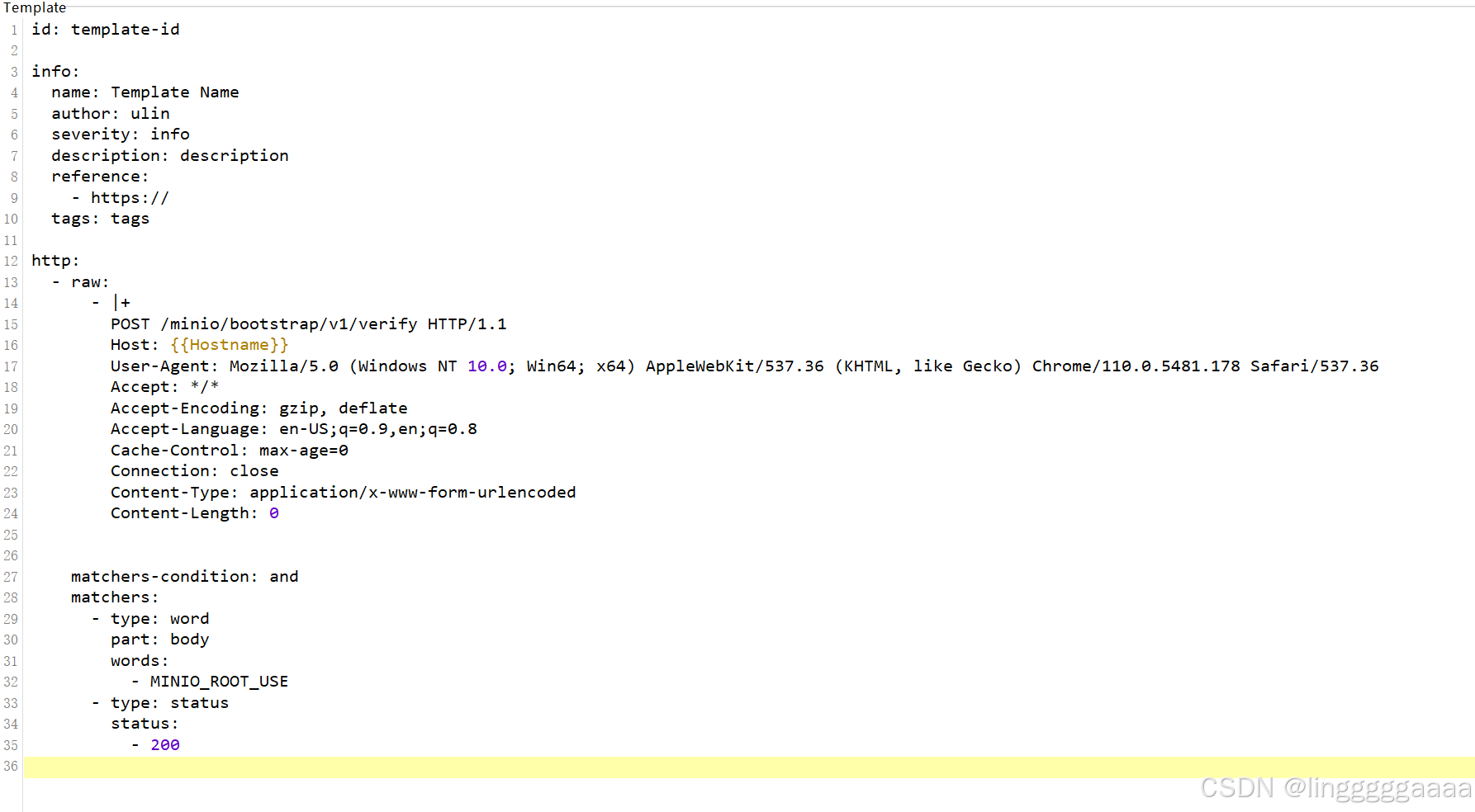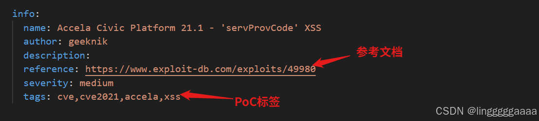 - 编写PoC的Yaml模板一般包含如下描述性内容: