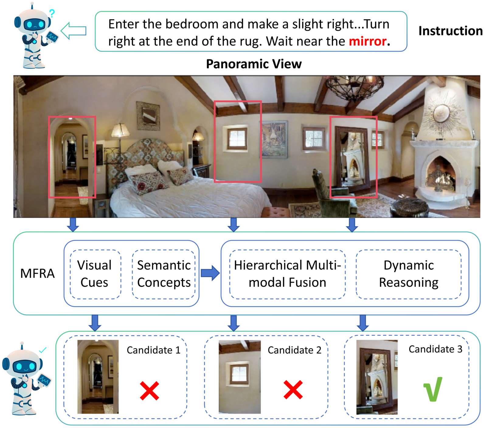 为了解决VLN任务中多模态语义对齐和上下文感知推理的挑战,提出了多级融合和推理架构(MFRA),该架构能够联合建模全景视觉观察、自然语言指令和智能体的导航历史。