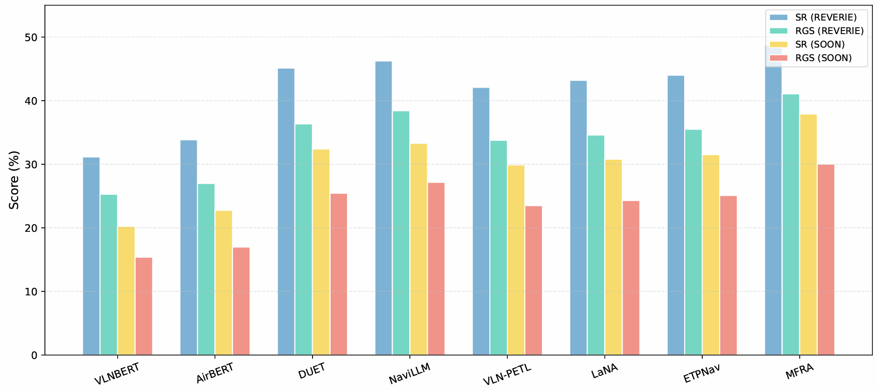 - 在这两个数据集上,MFRA在成功率(SR)和远程定位成功率(RGS)方面均优于包括VLNBERT、AirBERT、DUET等经典Transformer模型以及NaviLLM、VLN-PETL、LaNA和ETPNav等最新方法。