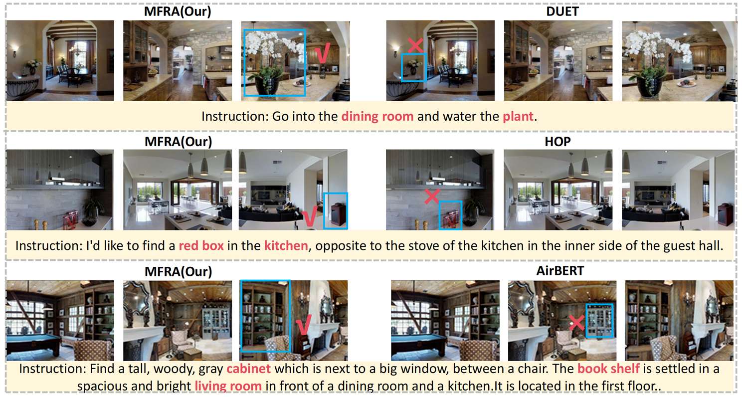 - 动态多头转置注意力和门控前馈网络的集成使模型能够选择性地关注与指令相关的区域,提高跨模态语义对齐和决策信心。与AirBERT或VLNBERT等以对象为中心的方法相比,MFRA受益于事实级定位机制,能够捕捉到超出静态对象标签的丰富上下文信息,使智能体能够在指令中推理出细粒度视觉线索和高级语义引用。