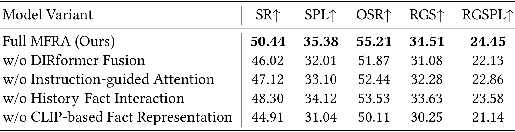 - 结论:MFRA中的每个模块,尤其是DIRformer融合和CLIP基础表示,对于实现准确且可泛化的指令定位导航至关重要。