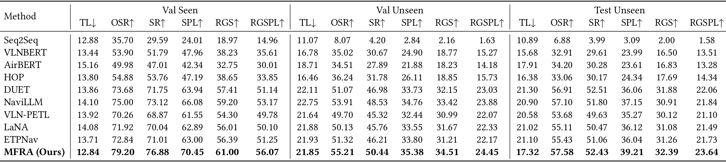 - 在R2R数据集上,MFRA与其他多种代表性最新方法相比,在所有评估指标上均展现出优越性。例如,与DUET相比,在验证集上SR提升了5.13%,SPL提升了6.51%。