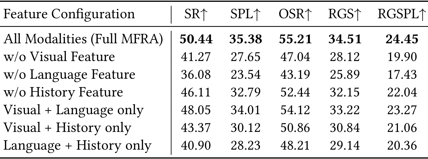 - 结论:视觉、语言和历史三种模态在支持有效导航和定位方面发挥了互补作用。