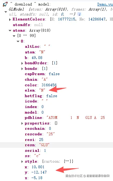 打印模型信息,可以看到在atoms属性有所有原子的信息