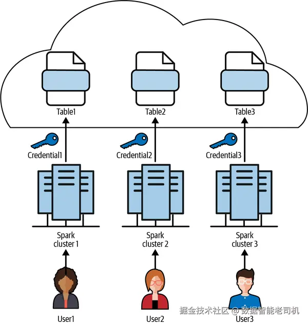 将凭证与 Spark 集群耦合 ,在多租户/多应用 环境中会成为瓶颈 :为每个用户或应用分配专属集群既昂贵 又浪费 ,易造成资源利用不足 。在集群层 做数据隔离还带来重大安全风险 :凡是能访问该集群的人,都可能读取云存储中的敏感数据 。当凭证挂在集群上时,只要能进集群,就可能访问数据,与用户本身的角色/权限无关 。因此,显然需要更细粒度 的访问控制。管理员常用的方法是为每个用户或应用 各自开一套 Spark 集群来实现隔离(见图 2-4)。