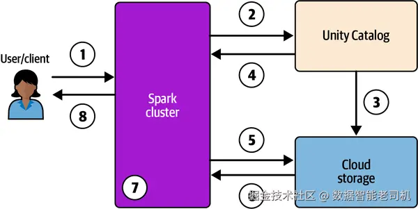 当你在 UC 计算集群或**仓库(warehouse)**中运行查询,幕后流程如下: