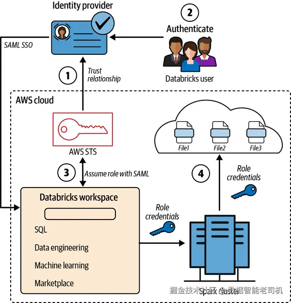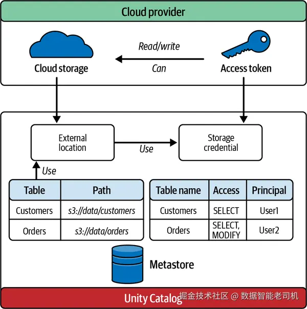 到目前为止,我们已解释了定义 Unity Catalog 架构的两个基础特性:集中式账号 与区域绑定的 metastore 概念。接下来,我们从凭证管理流程 入手,看看 Unity Catalog 如何落实治理。我们将说明 Unity Catalog 如何在中心化 地管理凭证并安全授权 :将访问权限授予被隔离的单个用户与进程 ,而不是挂到一个"人人同权"的集群上。一旦在 Unity Catalog 中安全注册了某个凭证,我们将进一步讲解如何使用存储凭证(storage credential)来创建外部位置(external location) ,映射到云存储的位置。最后,本节将讨论 Unity Catalog 中的不同计算模式 ,以及在 Spark 集群中如何对进程与用户进行隔离------这构成了由 Unity Catalog Lakeguard(本章稍后讨论)所支持的关键架构设计。