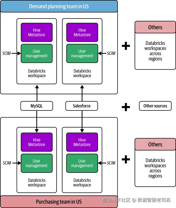 图 2-3 展示了使用 HMS 的美国地区 物流域架构,凸显其数据基础设施的复杂性。为简化示意,我们聚焦于需求计划 与采购 两个子域;但若考虑多区域内所有域/子域与合计 500 个 Databricks 工作区 ,实际架构会复杂得多。