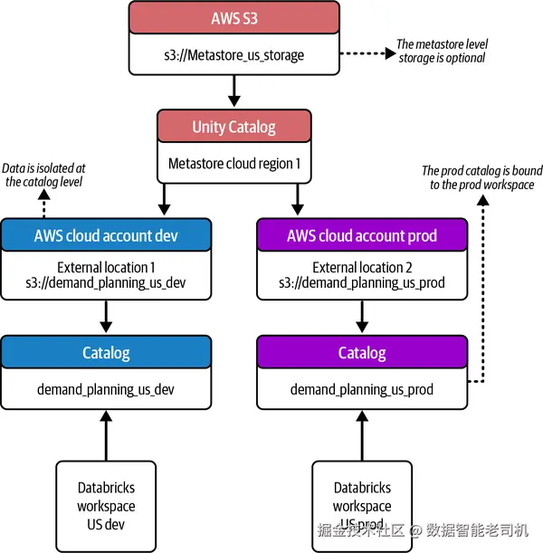 区域级 metastore 是 Unity Catalog 中的最高抽象层 ,在控制平面提供集中式的元数据存储库。你可以选择将所有托管数据 放在与该 metastore 关联的集中式云存储位置 中。然而,对于需要严格数据分离(受法规或内部数据共享政策驱动)的领域或应用,共享存储层并不能提供必要的隔离。
