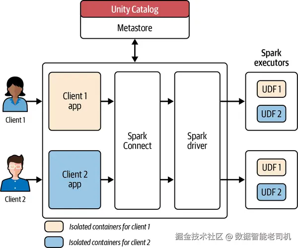 Spark Connect 以"瘦客户端库"的方式嵌入到应用服务器、IDE、notebook 与编程语言中;将客户端操作(如 SQL)用 protobuf 编码,并通过 gRPC 传给 Spark 服务器,从而实现客户端隔离 。当客户端向集群提交任务后,下一步是沙箱化 进程:把操作与相应用户代码部署到容器 中,互相隔离 ;UC Lakeguard 限制容器边界外的访问 ,防止用户进程跨越访问他人进程。
