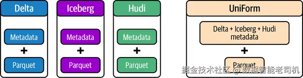 这些存储格式 主要在元数据层 存在差异,底层文件普遍采用 Parquet 。Databricks 还发布了 UniForm 兼容性 :消除对独立文件格式与事务日志 的需求,将一切统一到 Unity Catalog 之下,力图终结延续已久的"文件格式之争"。图 2-1 展示了 UniForm 如何自动生成元数据 ,使 Delta Parquet 文件可被以 Hudi 或 Iceberg 的方式访问 ,而无需为不同消费者复制文件。