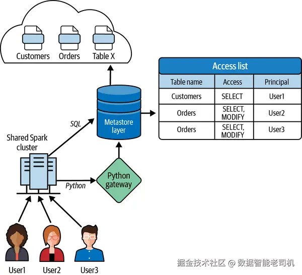 通过查询元数据表校验每位用户的授权,确保用户仅能访问被授予的数据。 - 阻断不受支持的 Spark API(如 RDD)