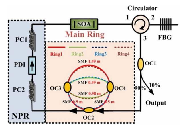 同时,四个子环谐振器插入在NPR和OC1之间。这些谐振器由三个2×2光耦合器(OC2、OC3和OC4)组成,每个光耦合器具有50:50的分光比。因此,这些光耦合器通过单模光纤SMF相互连接,每个环的SMF长度不同。事实上,环1、环2、环3 和环4分别设置为 2.49m、1.47m、1.49m 和 2.47 m。FBG带宽和主腔的纵模间距会导致光纤长度的差异。然而,每个环对应不同的谐振模式,并以其独特的颜色来区分,其中环1(红线)、环2(绿线)、环3(蓝线)和环4(灰线)。之后,来自OC1的90%信号进入OC2。随后,50%的输出光束被引导到NPR机构进行偏振调整,此外,剩余的50%的光能耦合到四个子环谐振器中,用作输出。激光模式仅在同步满足环1、环2、环3 和环4的谐振条件的频率上振荡。
